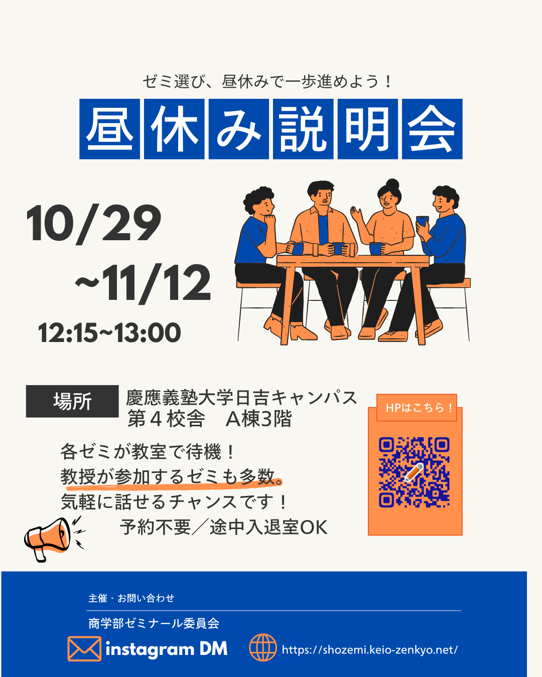 ゼミ選考に関する疑問や悩みを解決する場として、多くの方にご参加いただければと思います。ぜひ授業の合間にお気軽にご参加ください!