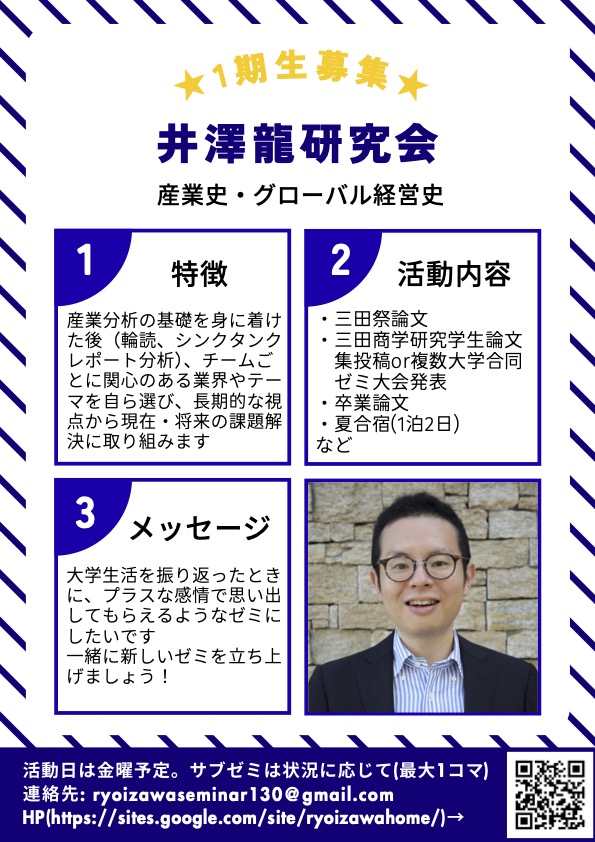 本研究会は産業分析の基礎を身に着けた後(輪読、シンクタンクレポート分析)、チームごとに関心のある業界やテーマを選び、長期的な視点から現在・将来の課題解決に取り組みます。テーマやゴール(3年次は、三田祭論文発表、三田商学研究学生論文集投稿、複数大学合同ゼミ大会発表など。4年次は、卒論)を学生主体で設定してもらうことで、自分のストーリーとしてゼミ活動を振り返られるような研究会としたいと考えています。